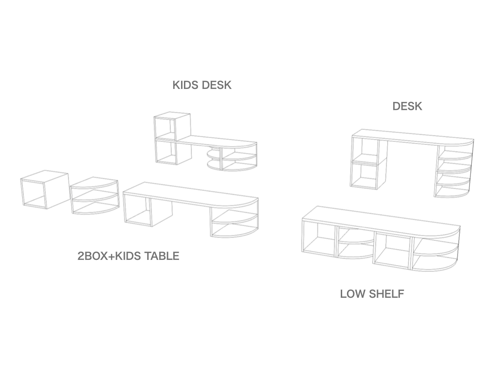 キッズテーブルをベースに2つの独立したボックスを加えることで機能を拡張でき、ボックスをキッズテーブルの間に納めてローシェルフ、立体的に積み上げて子供用のデスク、キッズテーブルの下に置くことで大人のデスクと変えられます。