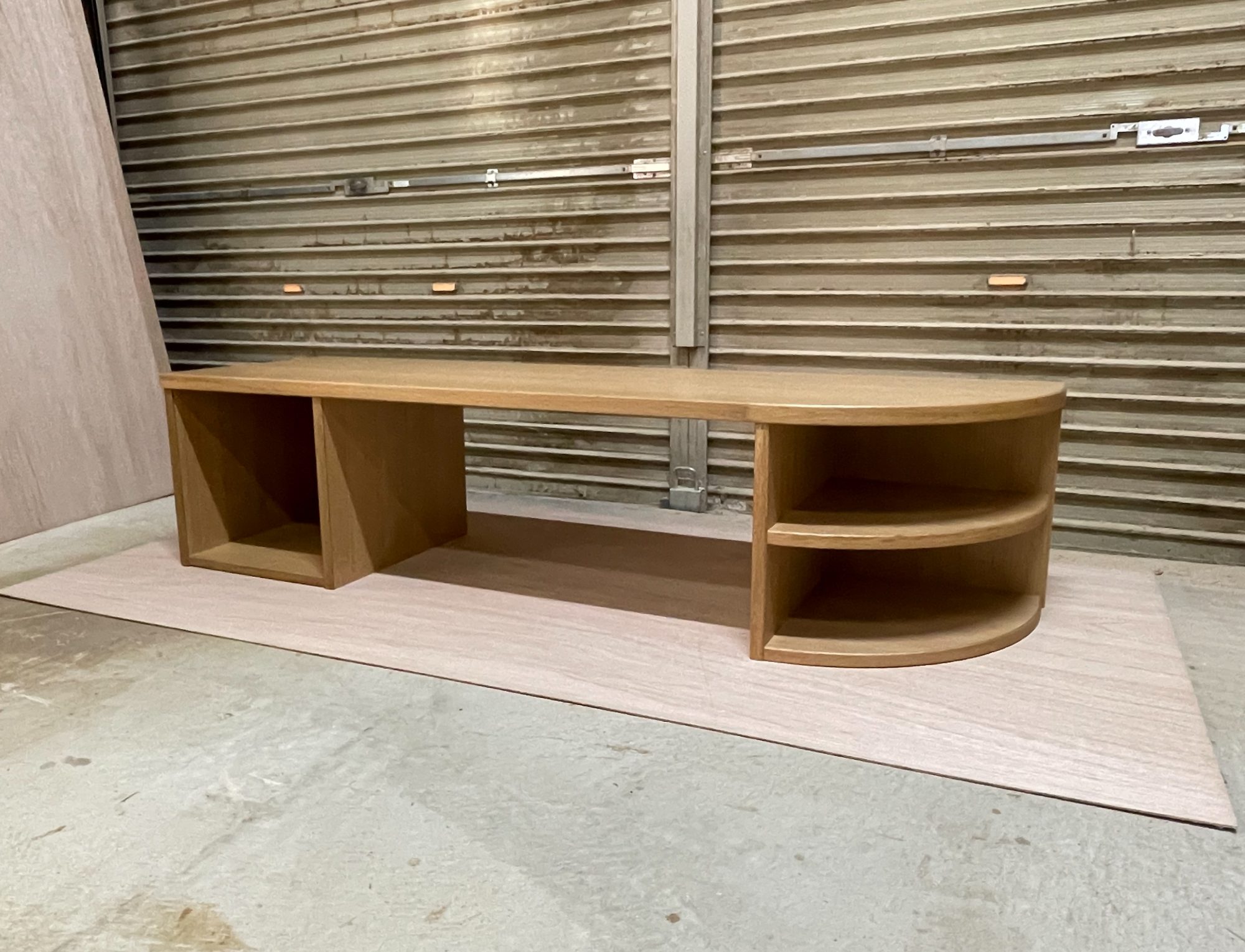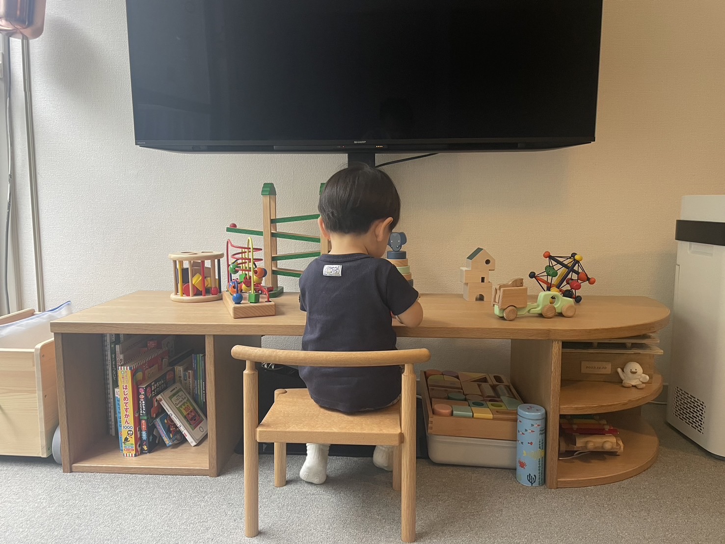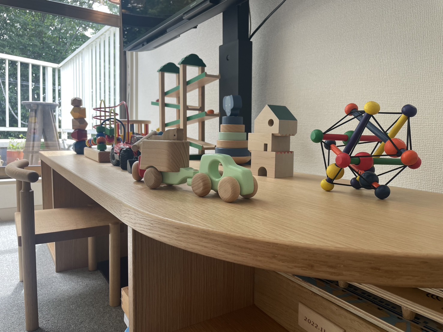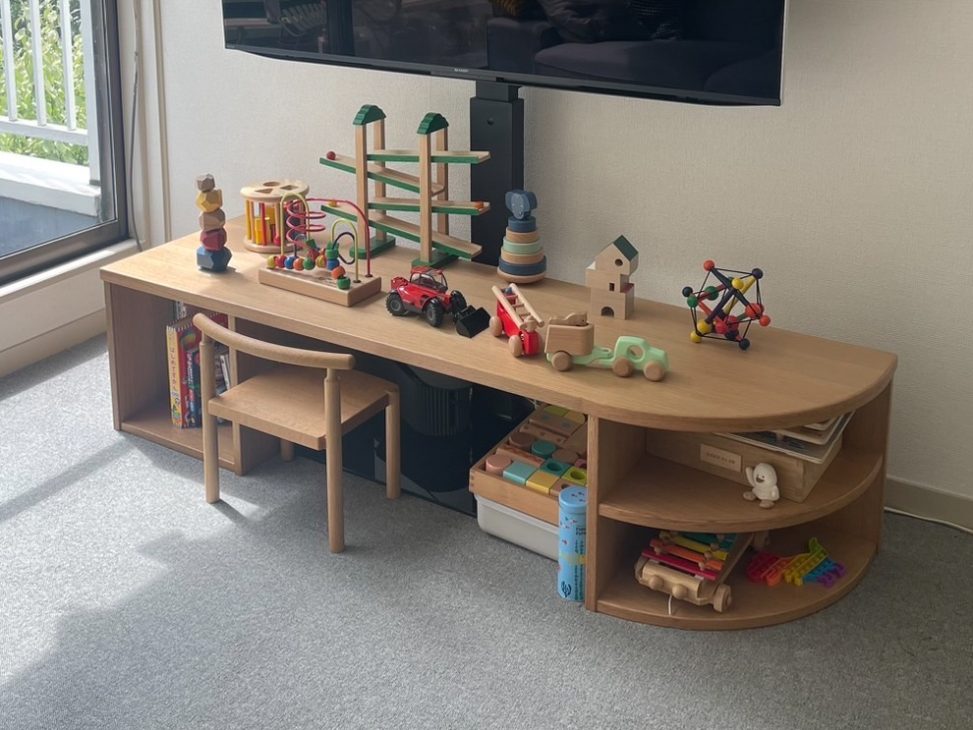 キッズテーブルはおもちゃや児童書を収納できるオープンボックスと天板の構成で、設置場所に合わせた左右非対称のデザインです。空間に存在感を出しながらカラフルな玩具や児童書が映える背景となっています。